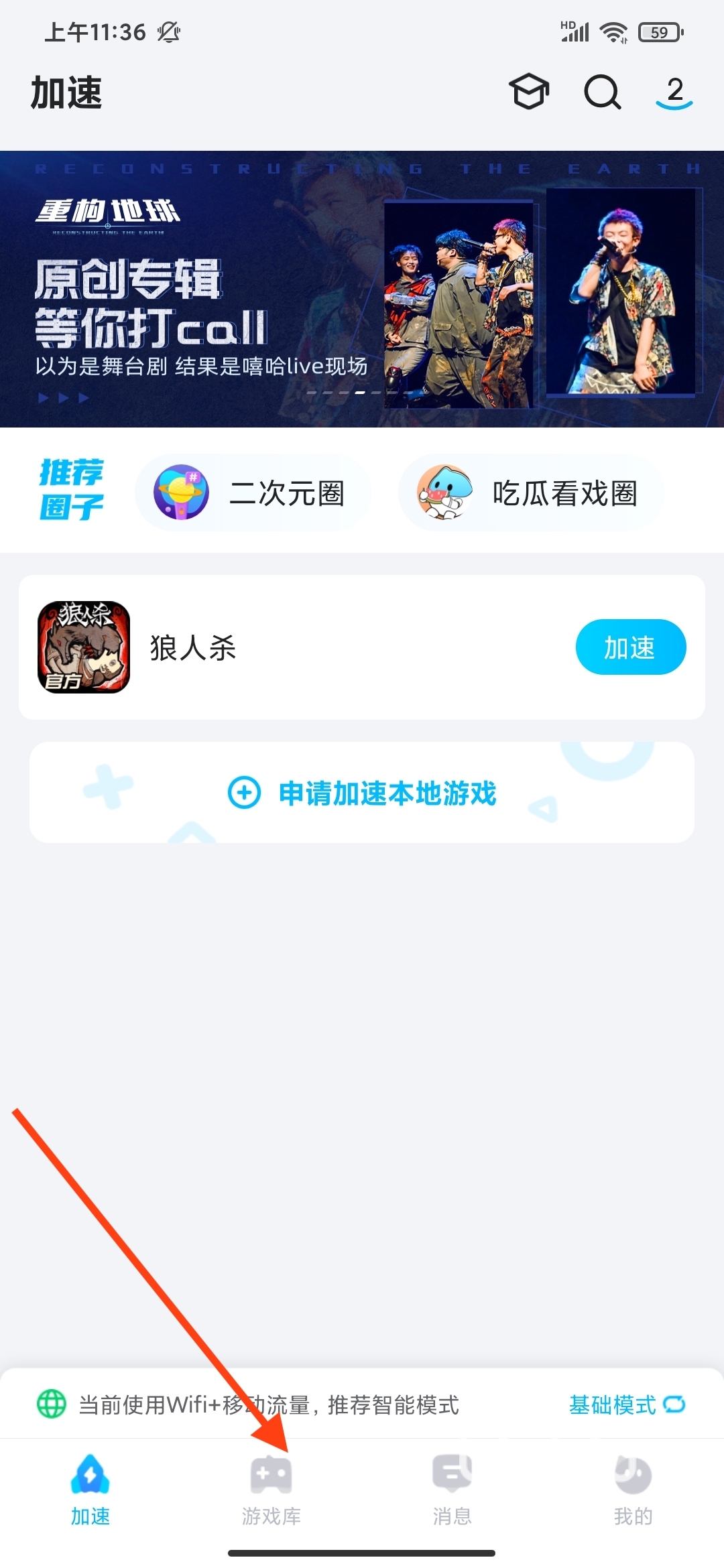 3、在biubiu加速器的下方導(dǎo)航欄選擇“游戲庫”按鈕,點擊。