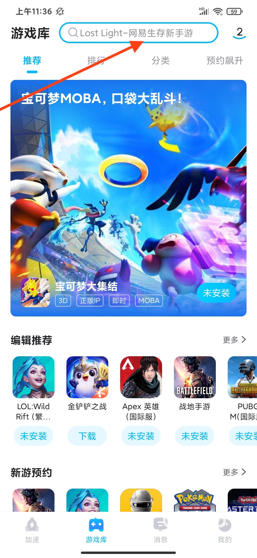 4、在biubiu加速器的游戲庫里面點擊頁面最上方的文本輸入框。