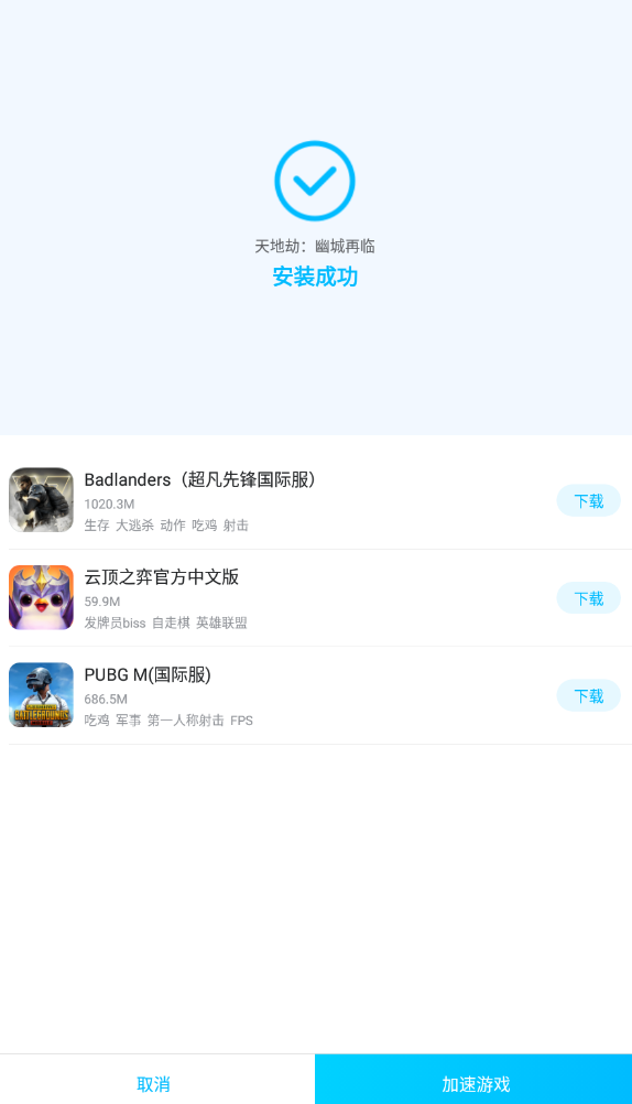 當(dāng)玩家完成了游戲安裝這一步之后,玩家就可以開(kāi)始加速游戲了,在游戲安裝成功界面的右下角,有一個(gè)加速游戲選項(xiàng),屆時(shí)玩家直接點(diǎn)擊這個(gè)選項(xiàng),就可以開(kāi)始游戲的加速了。