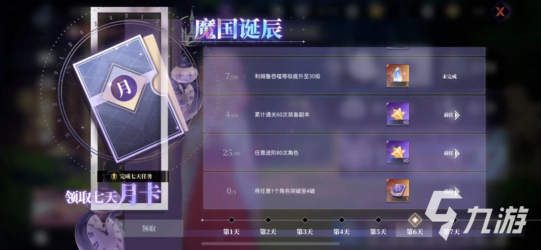 魔國誕辰是游戲內(nèi)的限時活動,屬于系統(tǒng)送給新手玩家的福利,需要玩家在注冊賬號十五天之內(nèi)完成,當(dāng)玩家完成特定的主線劇情之后,可以在游戲主頁面的左下角活動界面找到魔國誕辰,按照要求完成活動任務(wù)之后可以領(lǐng)取七日月卡體驗禮包,大家可別小瞧這個獎勵,月卡可是能幫助玩家快速積攢晶石的。