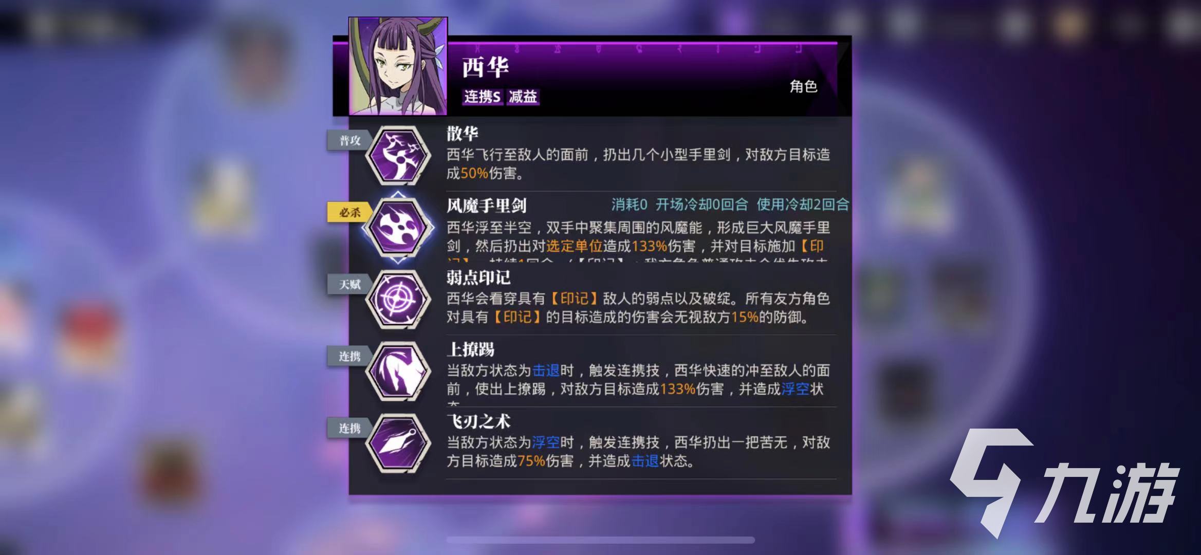 ?西華是減益型人物,標(biāo)注一下,她是S級(jí)的哦。帶的技能是一個(gè)普攻,一個(gè)必殺,一個(gè)天賦,兩個(gè)連攜,任何陣容選她效果都是不錯(cuò)的