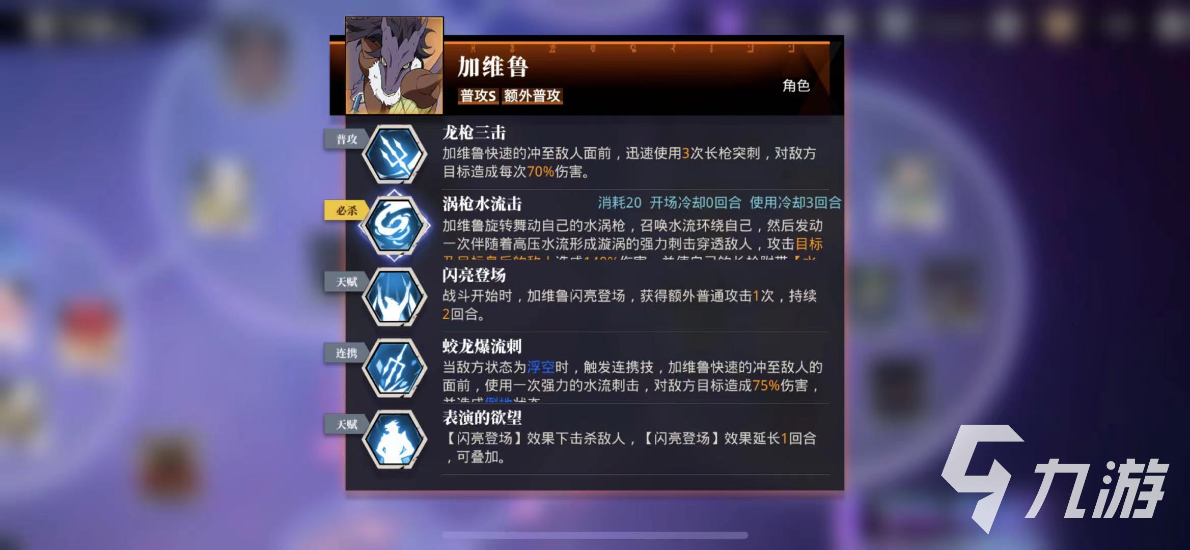 加維魯是額外普攻S級(jí)人物,帶的技能是一個(gè)普攻,一個(gè)必殺,兩個(gè)天賦,一個(gè)連攜,這個(gè)人物小編個(gè)人的建議他是非常值得培養(yǎng)的,他是游戲的首充角色獲取難度低,上手的難度簡(jiǎn)單,新手玩家也是可以輕松駕馭的