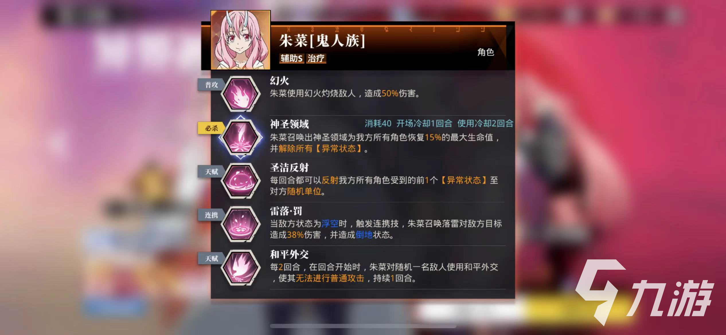 朱菜這個人物角色各個方便都很不錯,游戲內(nèi)的定位為輔助,而且還是S級別的人物,可以在隊友血量不夠時,給隊友增加生命值,同時還可以幫助隊友打敗敵人,是一個值得培養(yǎng)的人物。