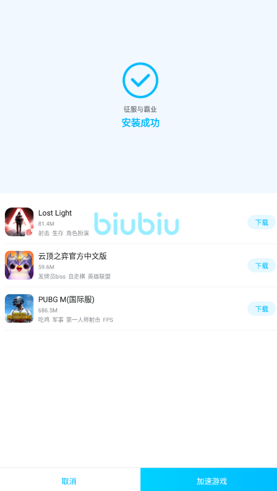 首先,玩家需要先下載并安裝好biubiu加速器,在biubiu加速器當(dāng)中,找到征服與霸業(yè)這款游戲,找到之后,點(diǎn)擊這款游戲右側(cè)的下載選項(xiàng),就可以開始下載這款游戲了。