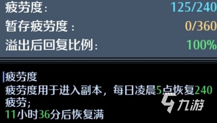 這里要知道每個玩家固定的疲勞值總量為二百四十點(diǎn),每三百六十秒將恢復(fù)一點(diǎn)的疲勞值,而在每天的早間五點(diǎn)中系統(tǒng)會全部回滿、若是玩家們此時還有多余的疲勞值,則會被存放起來,系統(tǒng)最高存放三百六十點(diǎn)。