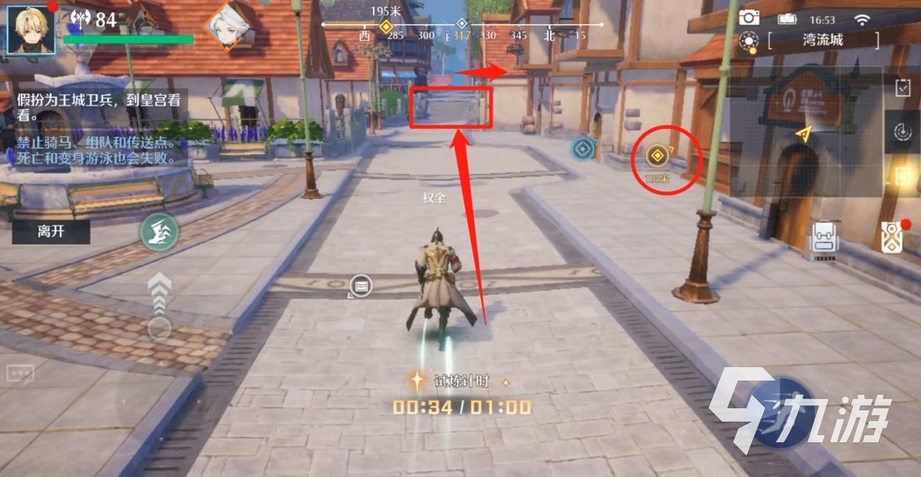 裝扮成王城的衛(wèi)兵,前往皇宮。該任務(wù)需要在德?tīng)柗铺m平原的灣流城處接取。整個(gè)任務(wù)直線距離長(zhǎng)達(dá)348米。限時(shí)只有1分鐘,超過(guò)就算失敗。與前兩個(gè)挑戰(zhàn)一樣,騎馬、組隊(duì)之類的也是禁止的。