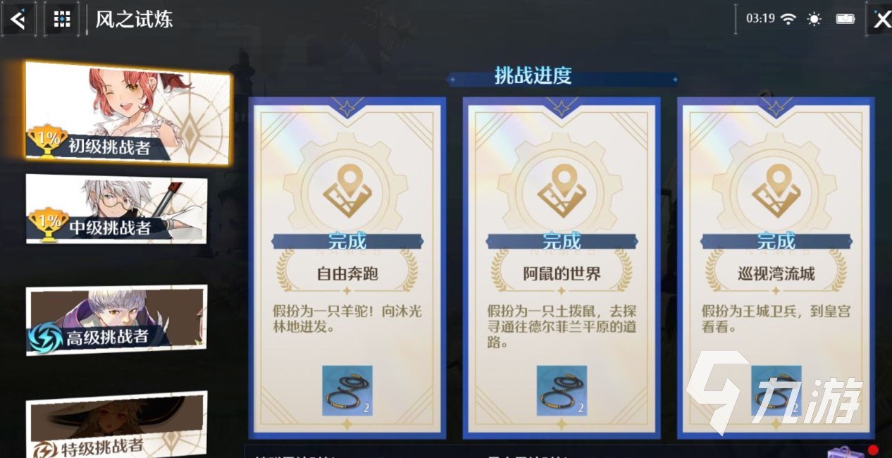 風(fēng)之試煉初級(jí)挑戰(zhàn)分為:自由奔跑、阿鼠的世界、巡視灣流城。
