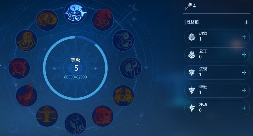 每個星座都有不同的性格值,性格分別有想象力、公正、樂觀、謙遜、沖動,大家可以使用技能點(diǎn)來增加這些性格的值數(shù),而每一個星座在升級時,都需要固定條件的性格值數(shù),在升級了星座后,它會給小伙伴們增加生命值、攻擊力、防御力。