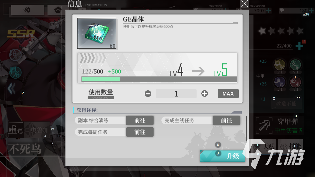 第一個方式也就是最為直接的方式,使用GE晶體來快速的提升艦靈等級。這個道具的話目前是沒有品級區(qū)分的,每個晶體帶來的經(jīng)驗值都是一樣的。操作方式也很簡單,選擇艦靈之后,選擇等級旁邊的加號按鈕就可以進入到提升界面了,可以根據(jù)需求來選擇晶體的消耗,也可以一次性的加滿。