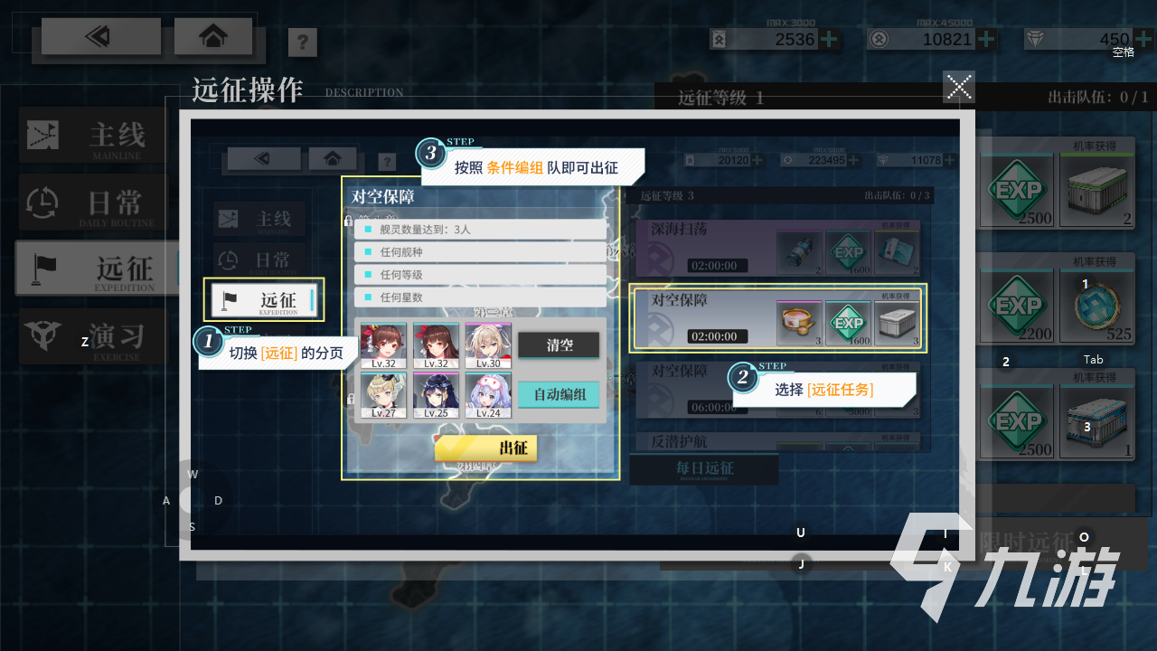 下來(lái)介紹一下玩法的操作,在進(jìn)入到出擊界面之后,點(diǎn)擊左側(cè)的遠(yuǎn)征圖標(biāo)就可以來(lái)到任務(wù)的界面。遠(yuǎn)征是以任務(wù)的方式來(lái)進(jìn)行的,但是玩家不用進(jìn)行戰(zhàn)斗的操作,要做的就是進(jìn)行編隊(duì)。這里大家要注意遠(yuǎn)征任務(wù)的隊(duì)伍不是說(shuō)自由編輯的,而是要根據(jù)任務(wù)的要求來(lái)進(jìn)行選擇的。比如說(shuō)一些任務(wù)要艦靈的定位以及等級(jí),玩家就要按照要求來(lái)選擇,否則的話是無(wú)法進(jìn)行出擊的。