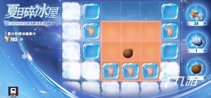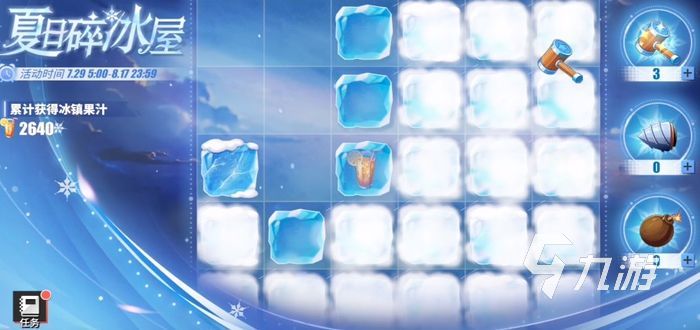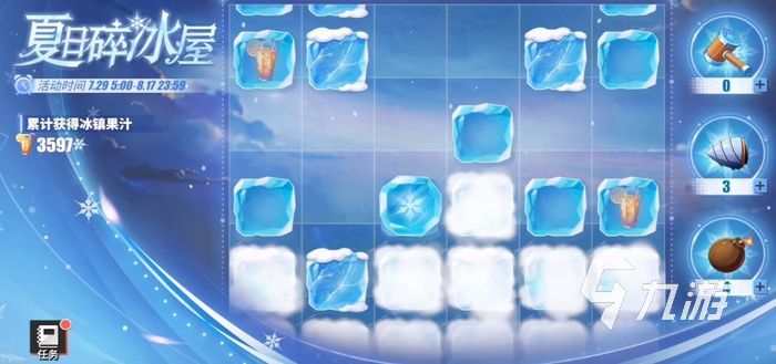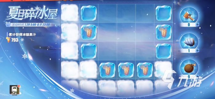 右邊有三個(gè)道具,分別是木錘、鉆子、炸彈。點(diǎn)擊木錘再點(diǎn)擊冰塊就可以敲開他了,一些冰塊中封著冰鎮(zhèn)果汁,而當(dāng)你們敲開這類的冰塊后就可以直接獲得他們,冰鎮(zhèn)果汁在活動(dòng)中類似兌換道具。