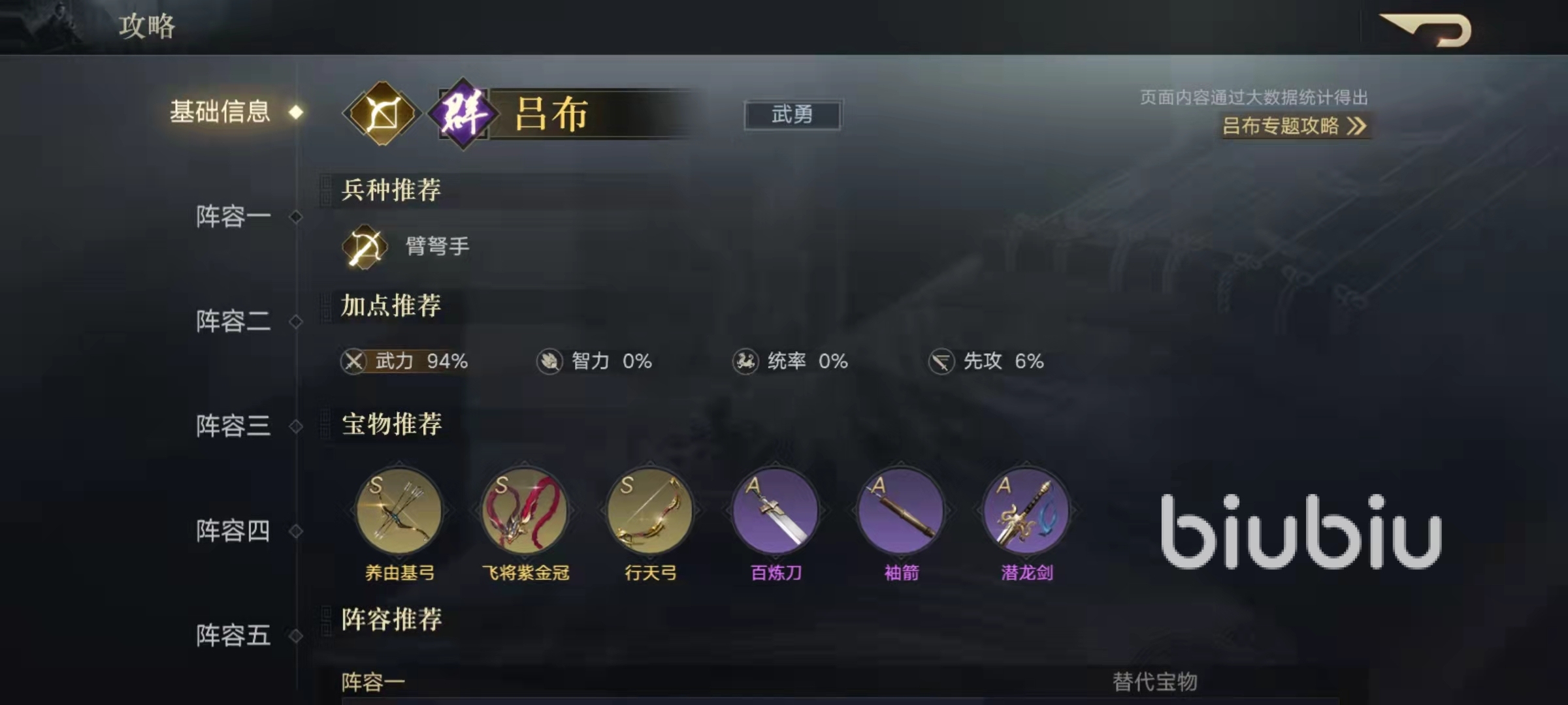 在兵種上面,推薦呂布選擇臂弩手,而且裝備上養(yǎng)由基之弓,飛將紫金冠等,這樣呂布的攻擊就非常有針對(duì)性了。在實(shí)戰(zhàn)中可以將呂布放在后排,這樣可以直接攻擊到對(duì)方的后排,而且可以利用大于五十步的傷害加成效果。總的來(lái)說(shuō)呂布在隊(duì)伍中就是一個(gè)后排輸出,這可能會(huì)顛覆之前的形象,不過(guò)輸出的數(shù)據(jù)絕對(duì)是對(duì)得起呂布這個(gè)名字的。