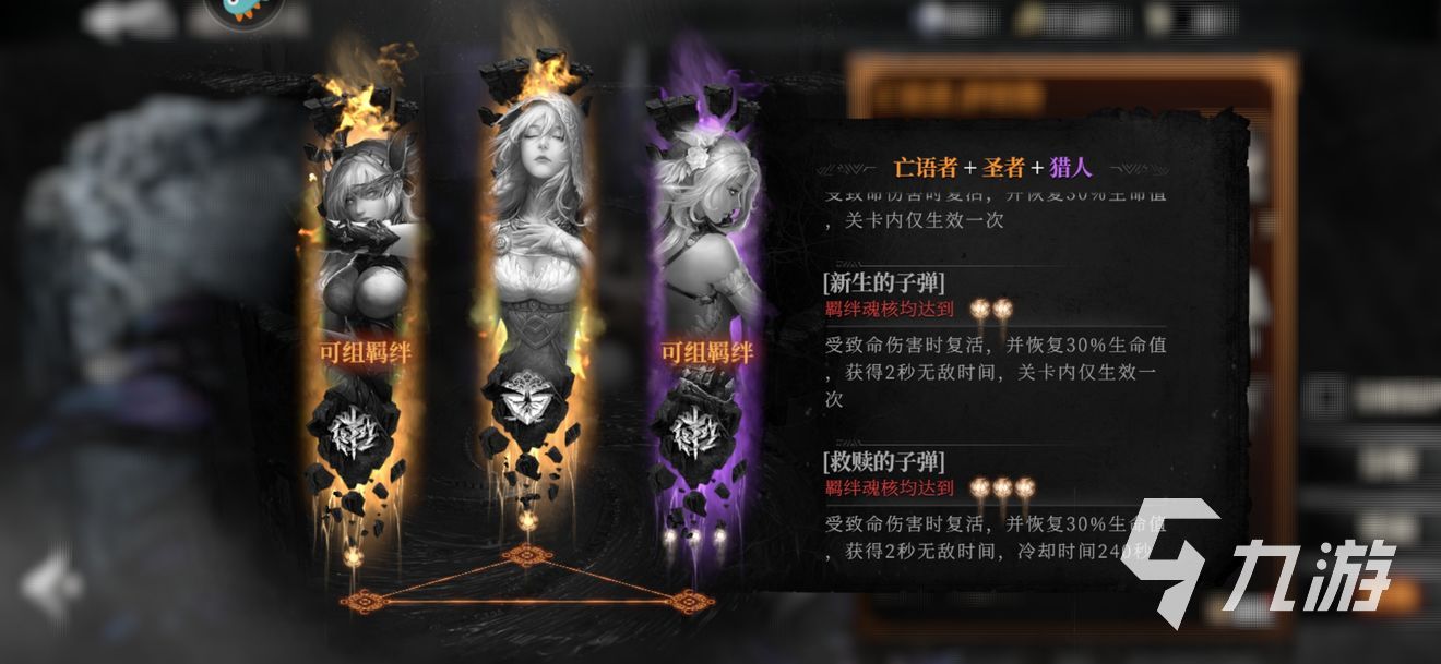第四個(gè)就是子彈系列了,小伙伴們將亡語(yǔ)者、圣者以及獵人這三個(gè)搭配在一起,就能湊出復(fù)活羈絆buff了,在提供復(fù)活以及回血的同時(shí),隨著等級(jí)的提升,還能獲得兩秒的無(wú)敵時(shí)間,如果將其提升到最高等級(jí),一旦冷卻結(jié)束就可以繼續(xù)提供復(fù)活buff了。