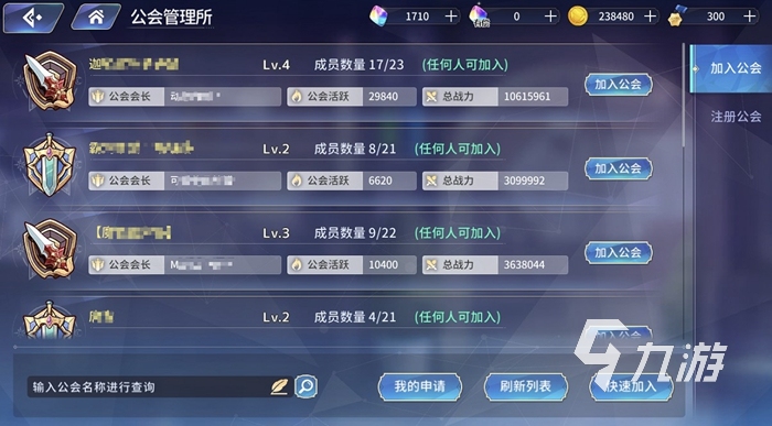 在這里我們可以看到公會的名稱、公會會長的id、公會活躍度、公會的總戰(zhàn)力以及成員的數(shù)量。如果公會設置的是任何人可加入的話,我們點擊申請就可以直接進入了。當然了,除了加入公會之外,我們自己也是可以建立公會的,但是不建議新手玩家嘗試,性價比不高。
