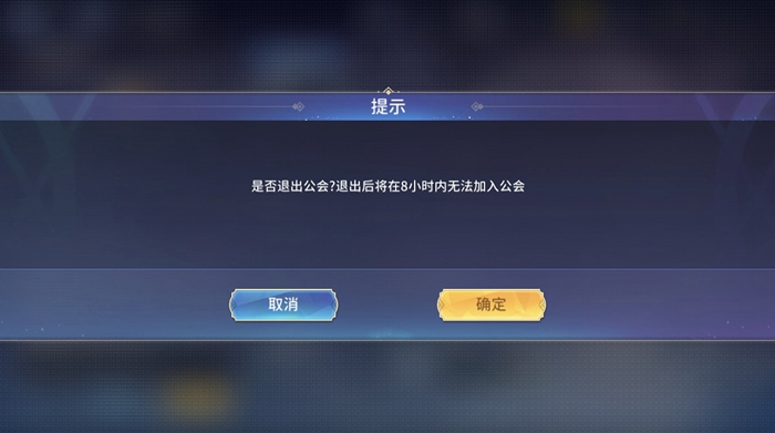 第四步:點(diǎn)擊退出公會之后會出現(xiàn)一個(gè)對話框,提示我們退出公會之后只有等待8個(gè)小時(shí)之后才可以加入或者是創(chuàng)建新的公會,這里點(diǎn)擊確定就成功從公會退出了。