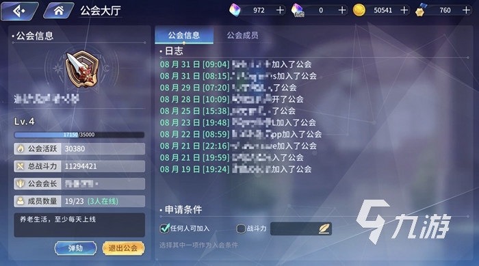 第三步:我們點(diǎn)擊成員詳情,就進(jìn)入到了公會的詳細(xì)信息以及公會成員的明細(xì),在這里我們可以看到左下方有一個(gè)退出公會的按鈕;