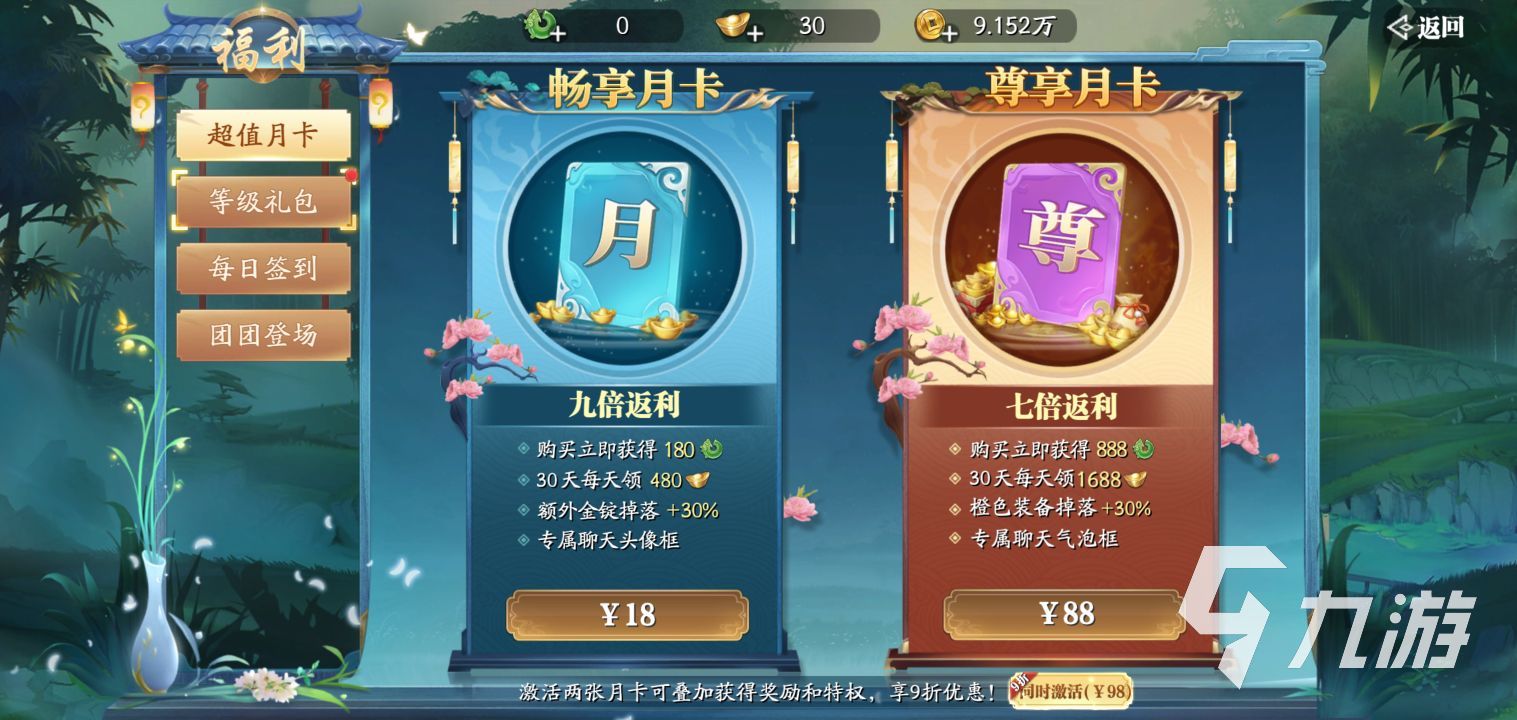月卡:進入幻世九歌游戲,一共有四種職業(yè)可以供玩家們選擇,每種角色的培養(yǎng)力度并沒有氪金差距之說,依然最推薦大家購買的就是月卡,這個游戲中的月卡一共分為兩種,分別為暢享月卡和尊享月卡,分別為18元和88元,購買了暢享月卡,可以每天獲得480元寶,并且立馬獲得180點靈玉,在主線任務(wù)或者是修煉的時候,副本掉落的金錠可以額外增加30%,而尊享月卡購買之后,立馬獲得888個靈玉,30天每天都可以領(lǐng)1688元寶,這一點對許多玩家來說就已經(jīng)夠用了,如果有條件的玩家,還可以同時疊加兩張月卡,并且享九折優(yōu)惠98就可以同時激活,如果打算在這個游戲氪金的話,一定要首選這里。