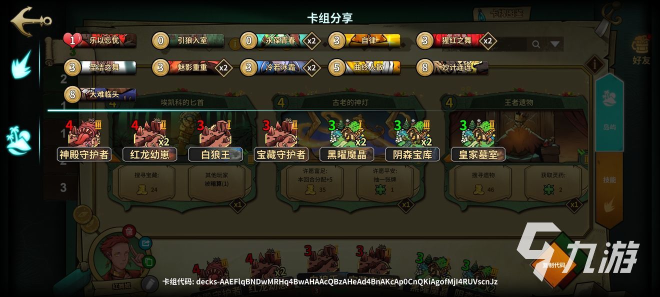 再就是紅島烏鴉,這一套卡組包含樂(lè)以忘憂、引狼入室、永葆青春、自律、猩紅之舞、圣潔之舞、魅影重重、冷若冰霜、曲終人散、妙計(jì)連連、大難臨頭。設(shè)施那里則包含神殿守護(hù)者、紅龍幼崽、白狼王、寶藏守護(hù)者、黑曜魔晶、陰森寶庫(kù)、皇家墓室。這一套下來(lái)可以將紅島發(fā)揮到極致。當(dāng)然去,缺點(diǎn)肯定也是有的,怕拉綠。