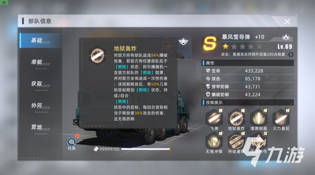 地獄轟炸,能夠?qū)橙巳w造成爆破傷害,對處于燃燒的狀態(tài)的敵人可以引爆敵方部隊(duì)的燃燒效果,然后造成一次性的傷害。與此同時(shí)該技能也有5成的概率也給人掛2回合的燃燒debuff。燃燒這個(gè)效果還是很imba的,可以每回合受到技能釋放者30%攻擊的傷害,并且尤其值得說明的是該傷害還是無視防御的?;鸺R射的效果與轟炸差不太多,只是少了引爆效果,但作為能量技釋放的時(shí)候,可以將燃燒晉升為融化,受到更高的持續(xù)傷害,并降低一半的治療效果。其它角色可以換,但這兩個(gè)要保持不變。