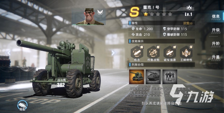第五個是霍克一號,他的品質(zhì)為金色的,定位是輸出類型的,普通攻擊為炮擊,每次攻擊對手能讓其進入短暫的眩暈狀態(tài),主動技能是烈轟戰(zhàn)炮,對敵方所有的對手進行無差別攻擊,攻擊之后會對地面造成一個大坑,處于坑中的對手會持續(xù)扣除生命值,被動是破軍強襲,也是削弱敵方護甲的效果,位置放在五號位,生命值在一千二百點,穿甲值在一百一十五點,攻擊力在二百一十點,破甲值在一百一十五點。