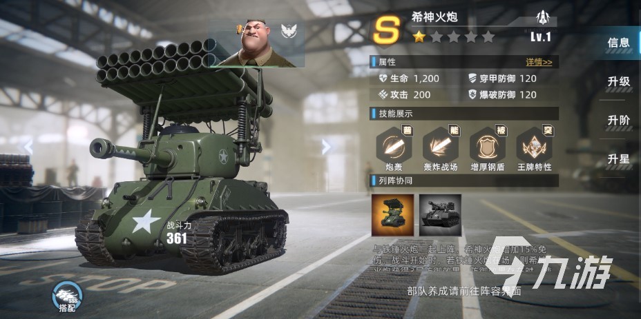第三個是希神火炮,他的品質(zhì)為金色的,定位是收割類型的,普通攻擊為炮轟,當攻擊到一名敵人時,他的子彈會變成擴散效果,對最為旁邊的對手也會造成傷害,主動技能是轟炸戰(zhàn)場,抬起自己的多排炮筒,接著向前發(fā)射大量超強的導彈,對所有敵人造成覆蓋式打擊,被動是增厚鋼盾,能提升全隊的護甲值,位置放在四號位,生命值在一千二百點,穿甲值在一百二十點,攻擊力在二百點,破甲值在一百二十點。