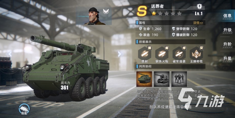 第四個是送葬者,他的品質(zhì)為金色的,定位是前排坦克類型的,普通攻擊為攢射,每次攻擊都可以進行蓄力,當蓄力過后發(fā)射的子彈可以得到穿甲效果,有了這個效果后,能直接攻擊到一縱列的對手,主動技能是鋼鐵火炮,對敵方軍隊發(fā)射一個重型炮彈,當炮彈打中對手后,可以增強自己的護甲值,被動是破軍強襲,能直接擊破敵方單位的護甲,位置放在一號位,生命值在一千二百點,穿甲值在一百二十點,攻擊力在一百九十點,破甲值在一百二十點。
