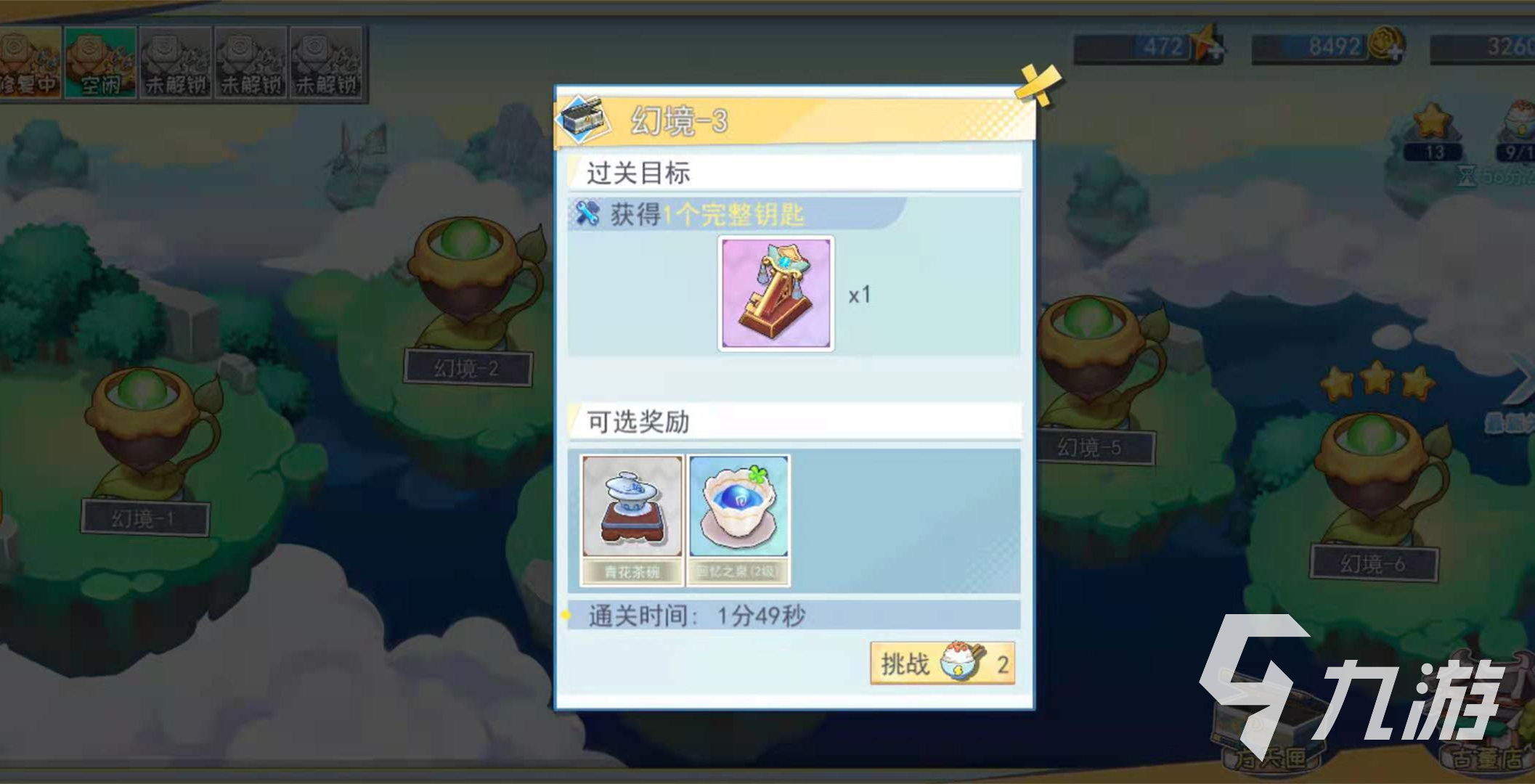 到了第三關(guān)也是獲得1個完整的鑰匙,獲得的獎勵處理青花茶碗之外還有一個2級的回憶之泉,有的海螺似的道具在沉睡的土地上,玩家將兩個沒在沉睡土地上海螺拖到和沉睡的海螺一條直線上就可以喚醒,其他的方法和海螺的方法是一樣。