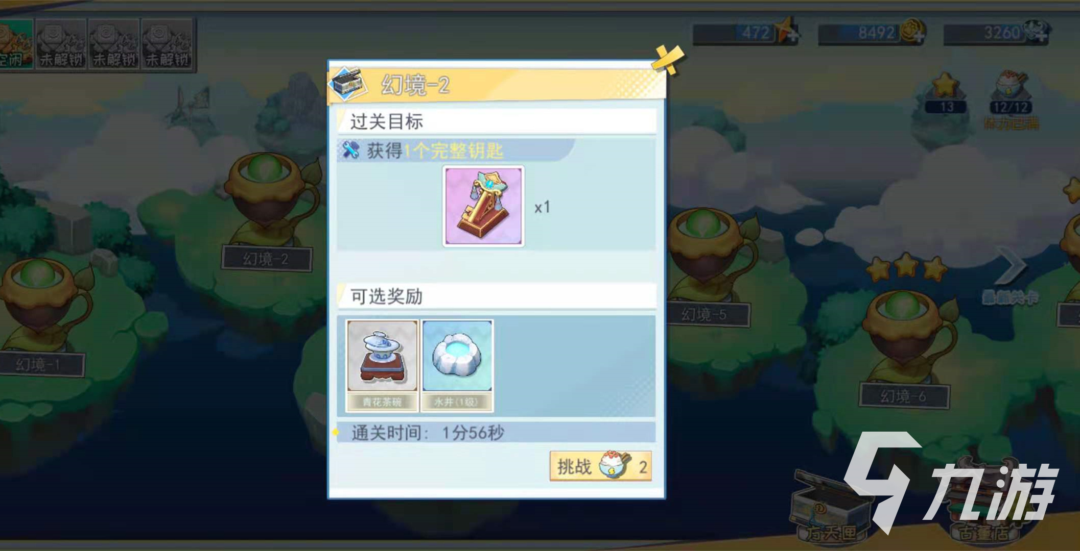 首先玩家進入到方天匣界面或者是古關(guān)董店界面,在右手邊靠下的位置就有幻境兩個字,玩家進入到幻境中,幻境1的闖關(guān)方法很簡單,小編就不仔細介紹了,挑戰(zhàn)到第二關(guān)卡,只要獲得1個完整的鑰匙就可以通關(guān),通關(guān)獎勵有一個青花瓷碗,這只碗是一只青花瓷茶碗,上面繪有精巧的山水紋路,獲得這只碗就可以到方天匣中進行修復了,獎勵中有一口一級水井,是代表情感源泉的小水井,升級到二級才能進行采集的。