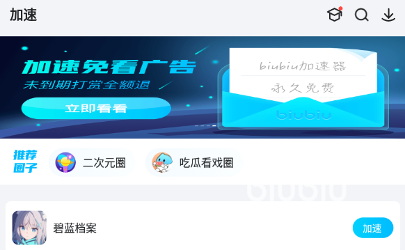 玩家在給碧藍檔案加速之前,需要先下載并安裝好biubiu加速器,然后在biubiu加速器當中,找到碧藍檔案這款游戲,點擊游戲旁邊的下載選項,就可以開始游戲的下載了。