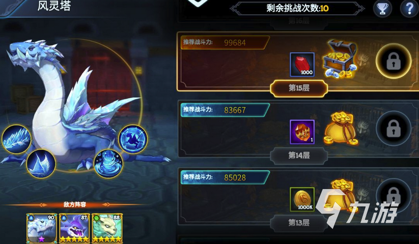 既然是塔型游戲,就必須有通關(guān)層數(shù)的設(shè)定。每一層都會(huì)有敵人把守。敵人的數(shù)量是六個(gè),玩家也可以選擇六條龍進(jìn)行戰(zhàn)斗。獲勝后,您可以獲得獎(jiǎng)勵(lì)并參加下一個(gè)挑戰(zhàn)。隨著層數(shù)的增加,戰(zhàn)斗的難度也會(huì)增加。