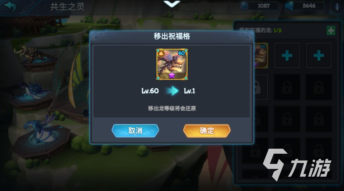 5、當龍被從祝福格中移除之后,該祝福格會進入到冷卻時期。移除出來的龍等級也恢復(fù)到未進入祝福格前的等級。只有祝福格被冷卻結(jié)束,這時才可以把龍放進去,為了加速祝福格冷卻速度,我們可以使用鉆石來調(diào)整祝福格的冷卻時長。