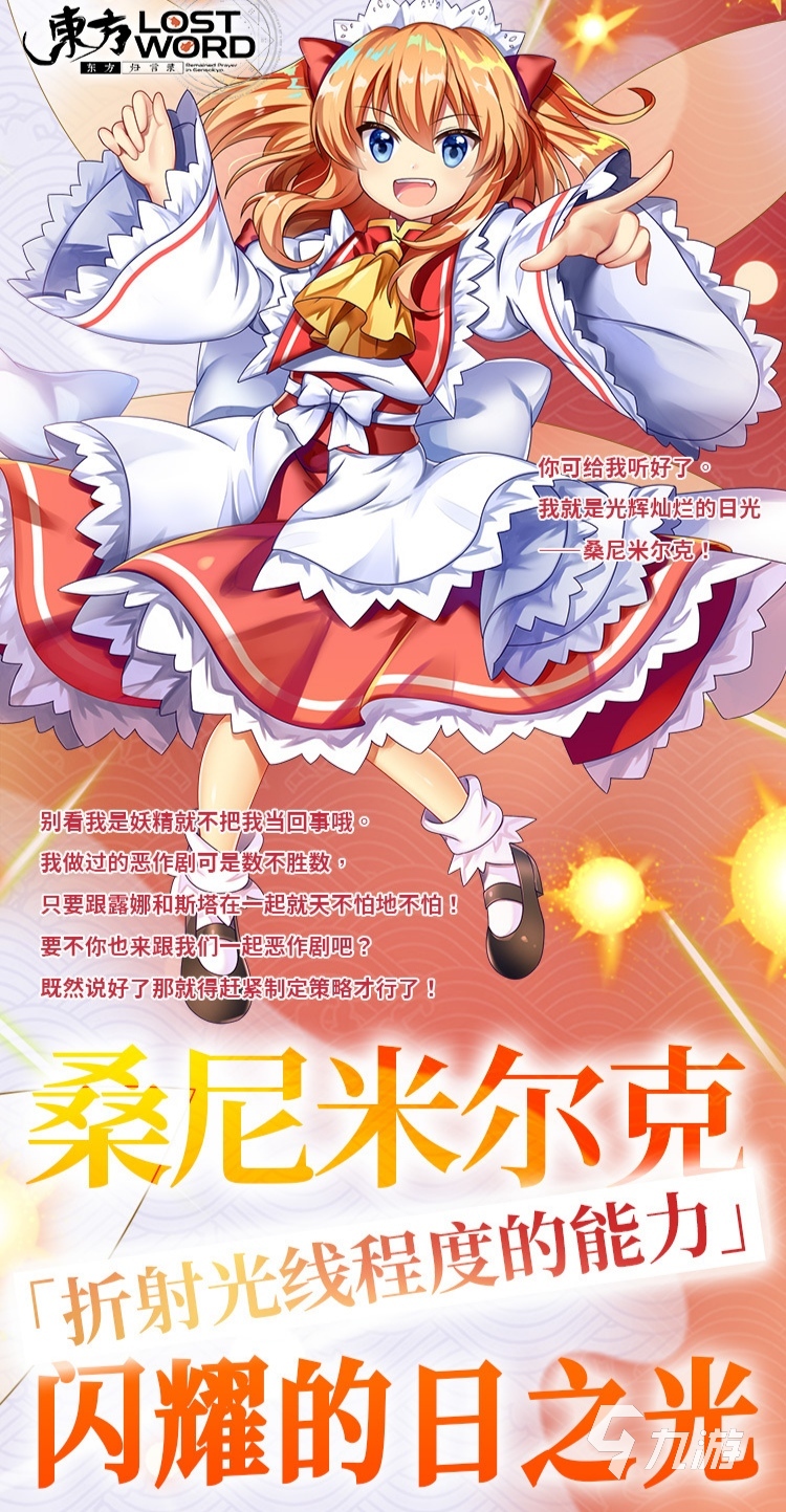 桑尼米爾克,一位定位為攻擊,別稱為閃耀的日之光的一名擁有折射光線程度的能力的輸出角色。光輝燦爛的日光桑尼米爾克,做過的惡作劇可是數(shù)不勝數(shù)哦,與露娜和斯塔在一起的時候,則更加放飛天性,一起商量做惡作劇的計謀,可正是一位調(diào)皮搗蛋的角色,到底值得玩家培養(yǎng)嗎?小編就給大家仔細(xì)介紹一下。