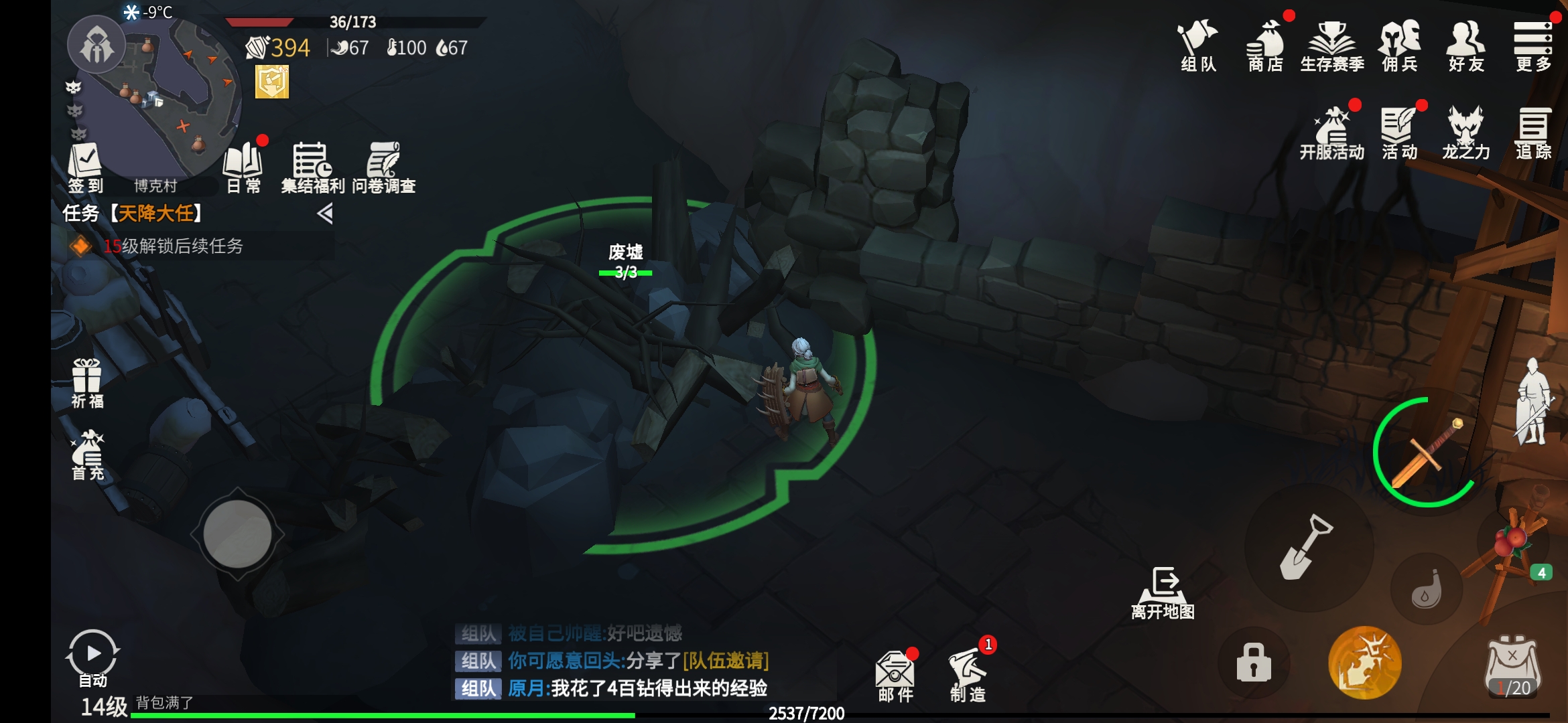 在屋子里沿著道路一直向左走,遇到廢墟的時(shí)候用木楸將廢墟砸開(如果沒有木楸的話可以用5個(gè)原木制作一下)。
