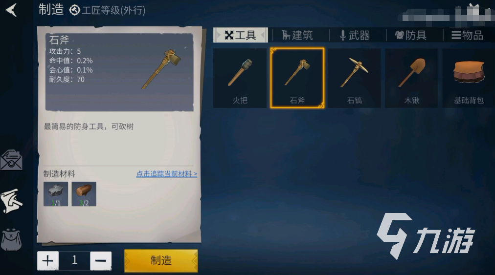 再來(lái)看一看石斧,石斧的話在前期階段是用來(lái)砍樹(shù)的,木材資源是前期的重要資源,所以說(shuō)石斧的用處還是很大的。這里建議大家砍一些血量較少的數(shù)目,效率會(huì)高一些的。