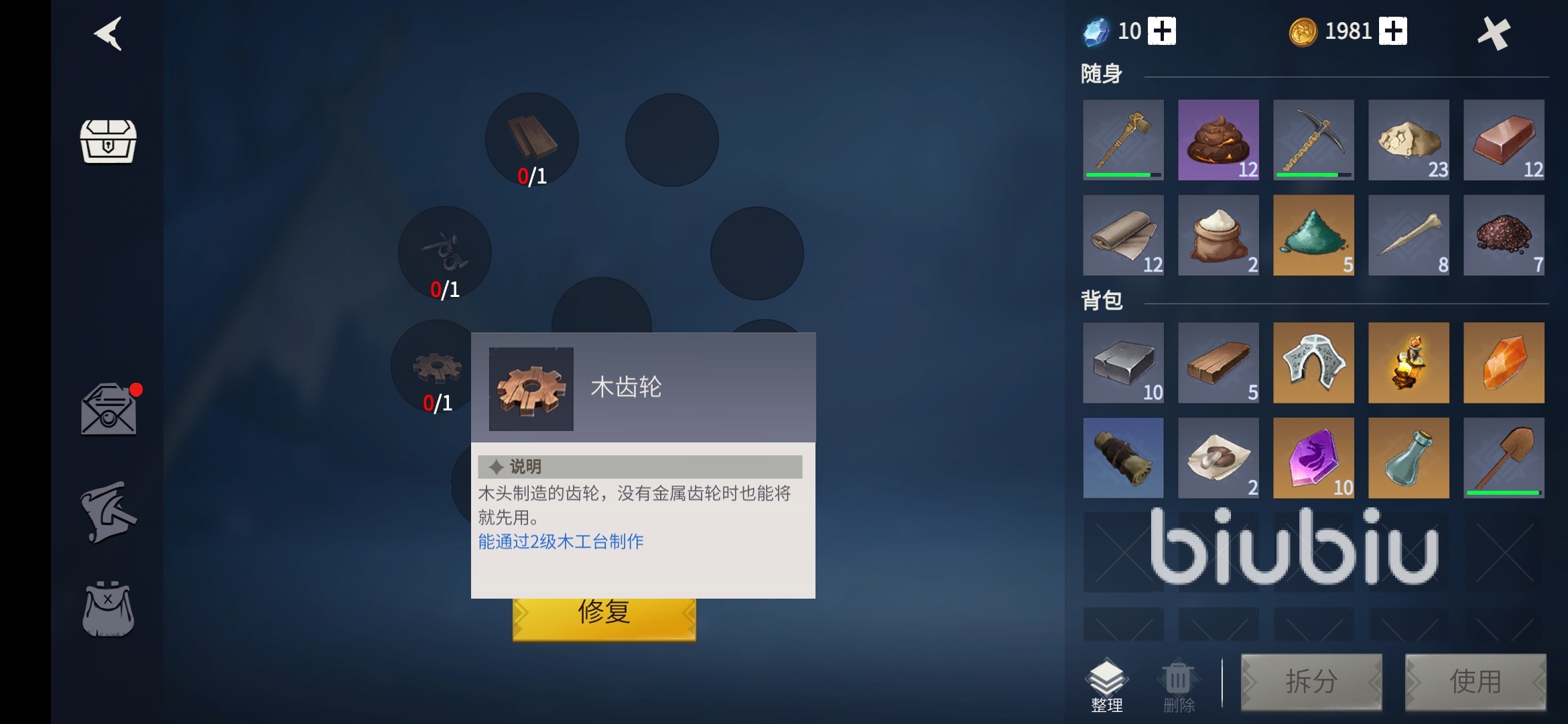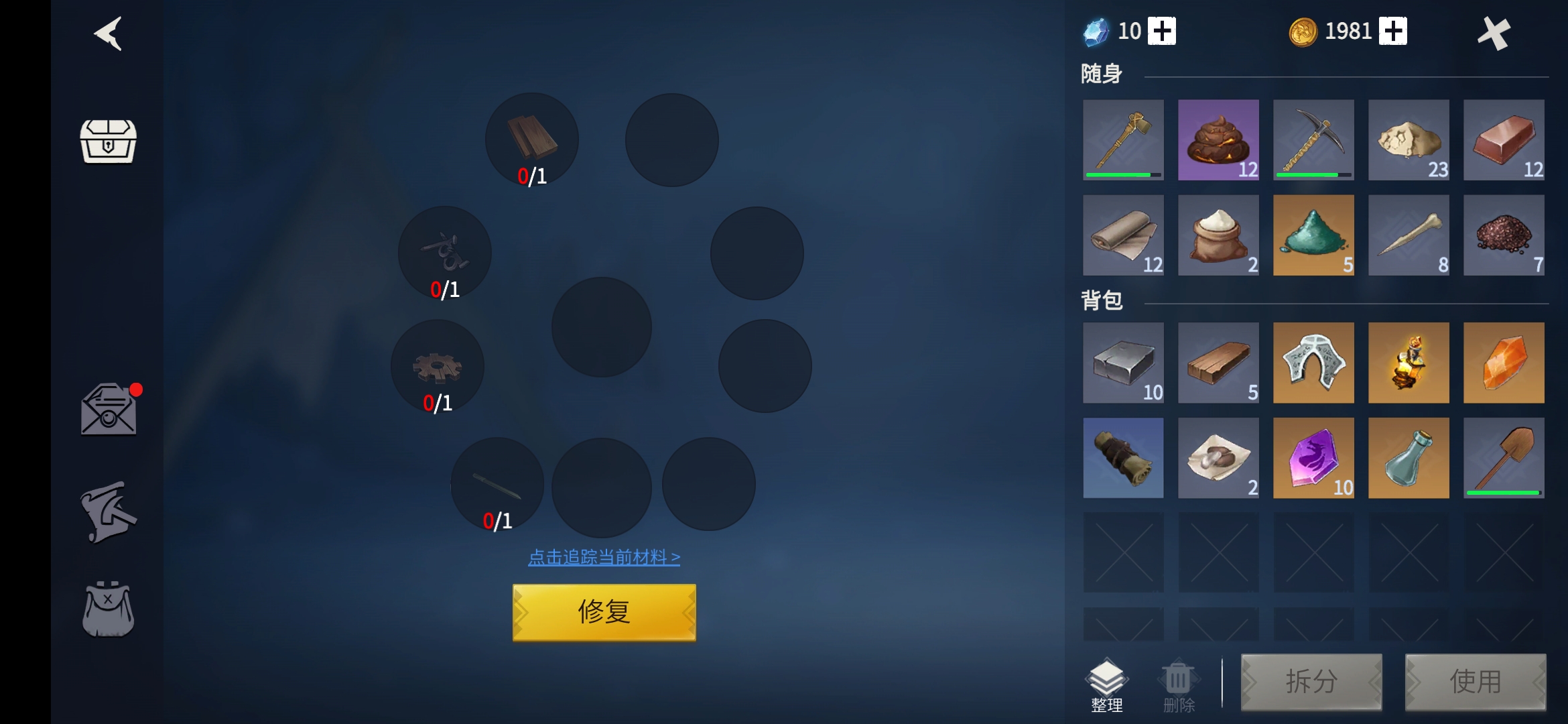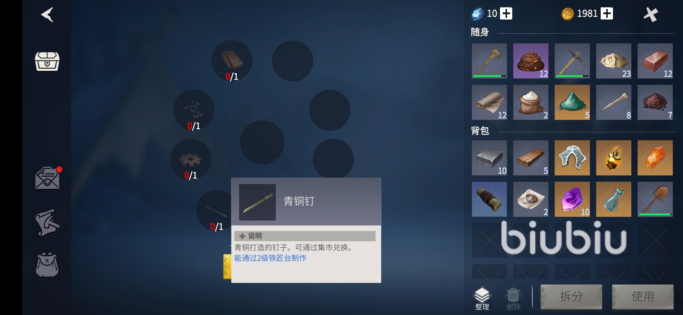 接著與升降梯互動,系統(tǒng)彈出修復升降梯所需要用到的道具:1、青銅釘,這個材料非常容易搜集,無論是在集市里兌換還是鐵匠臺制造需要的要求都不高,另外任務(wù)也會僧送。