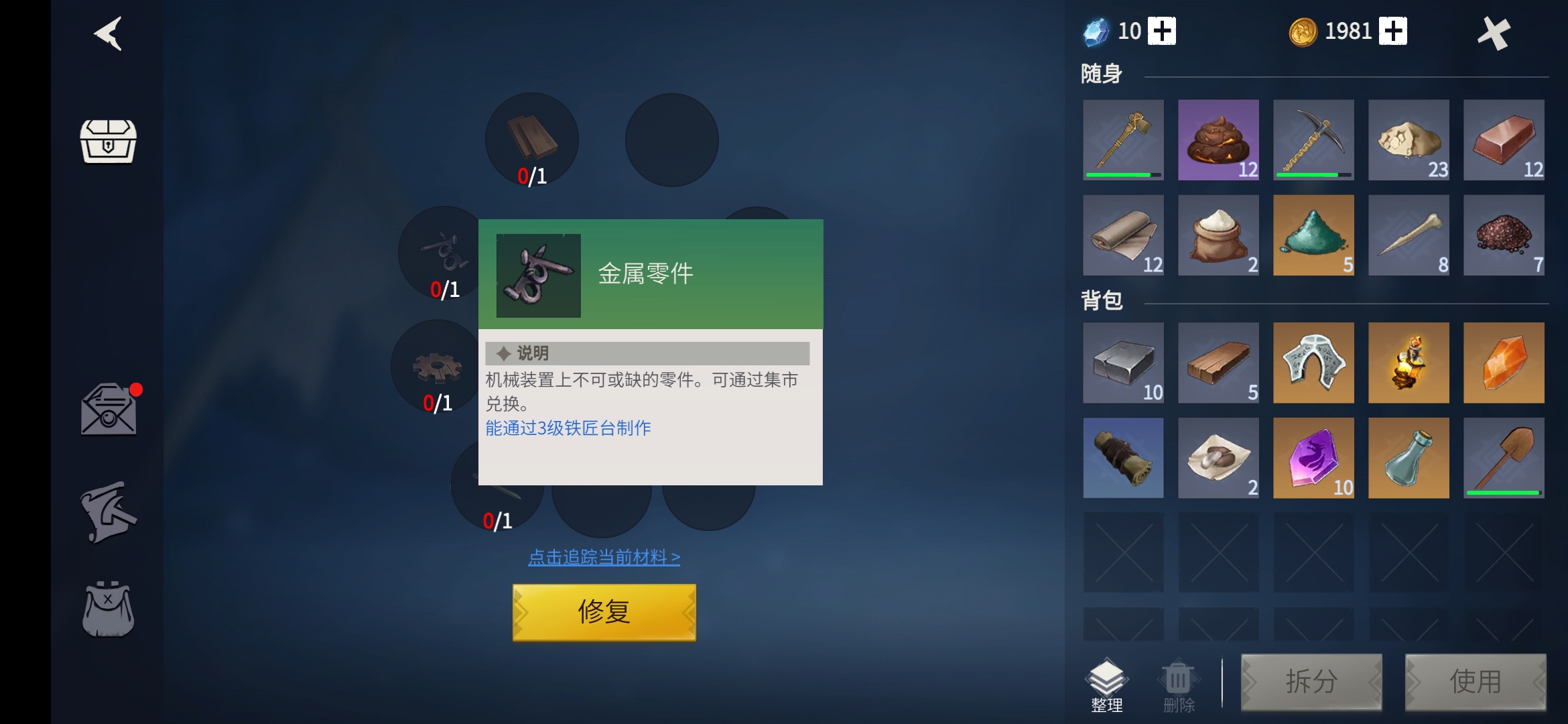 3、金屬零件,這個材料小編建議大家還是通過及時兌換比較好,3級鐵匠臺前期玩家要想得到需要耗費的升級材料太多,直接兌換省時省力。