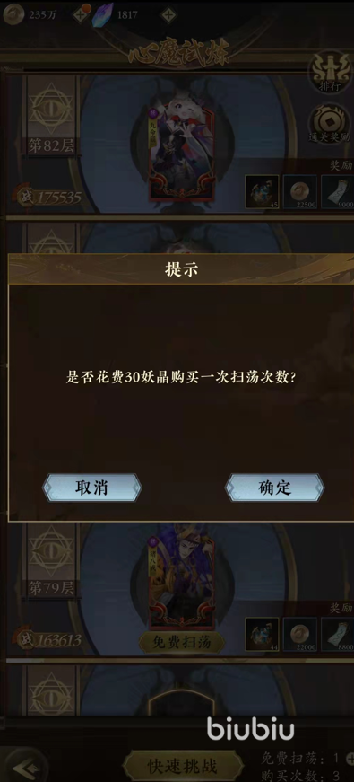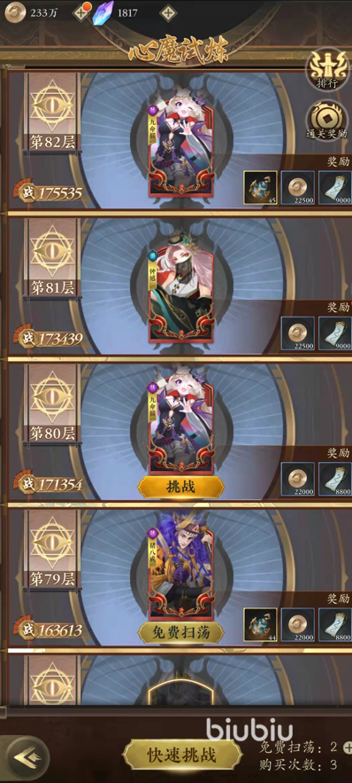 在這個關卡當中玩家每天可以獲得兩次免費掃蕩的機會,也就是說玩家在通關這個某一層的關卡之后,就可以用這個一鍵掃蕩的功能去將這個塔里面的所有獎勵物資全部收集起來,如果玩家挑戰(zhàn)的層數(shù)過多的話,就需要通過30個妖精去購買免費的掃蕩機會,每天大概可以購買三次左右也就是說玩家有五次機會可以挑戰(zhàn)。