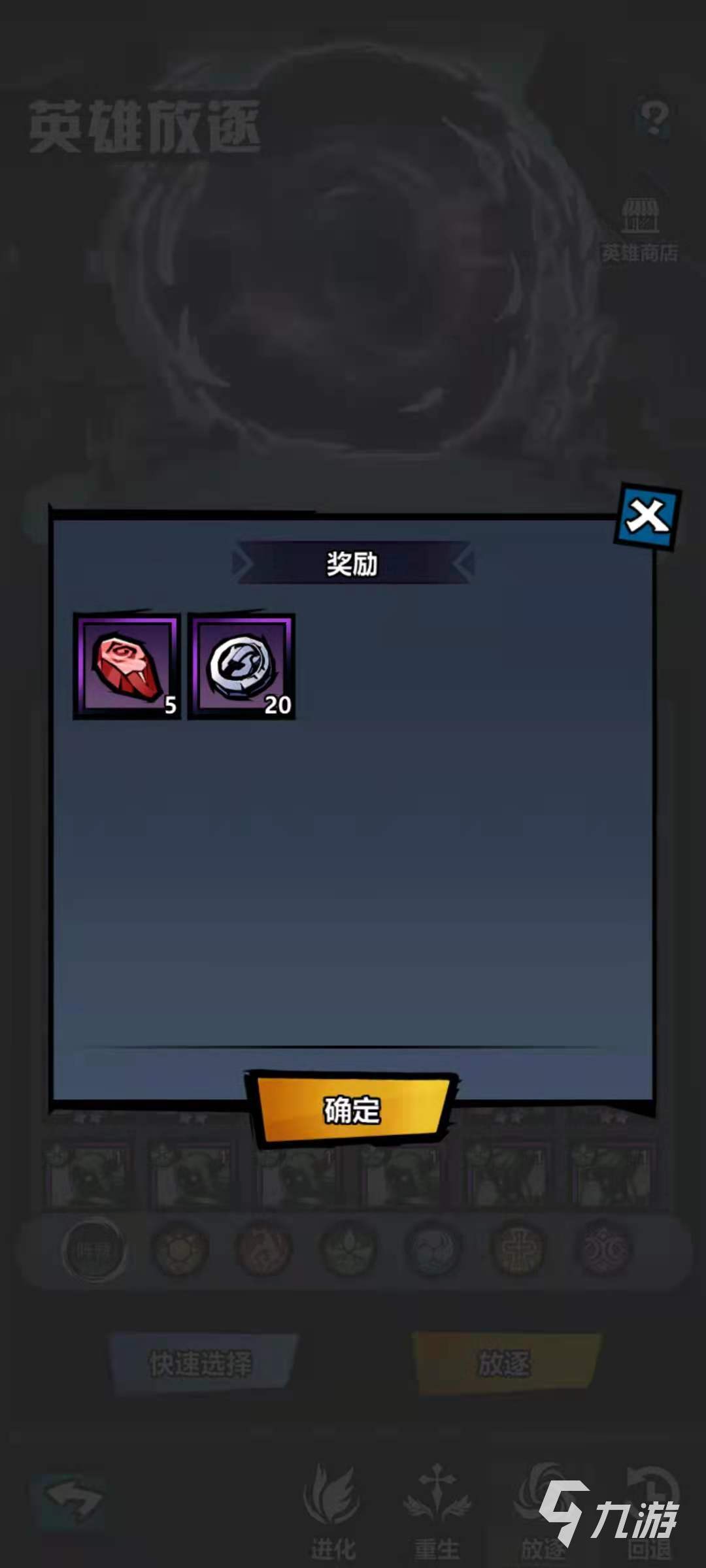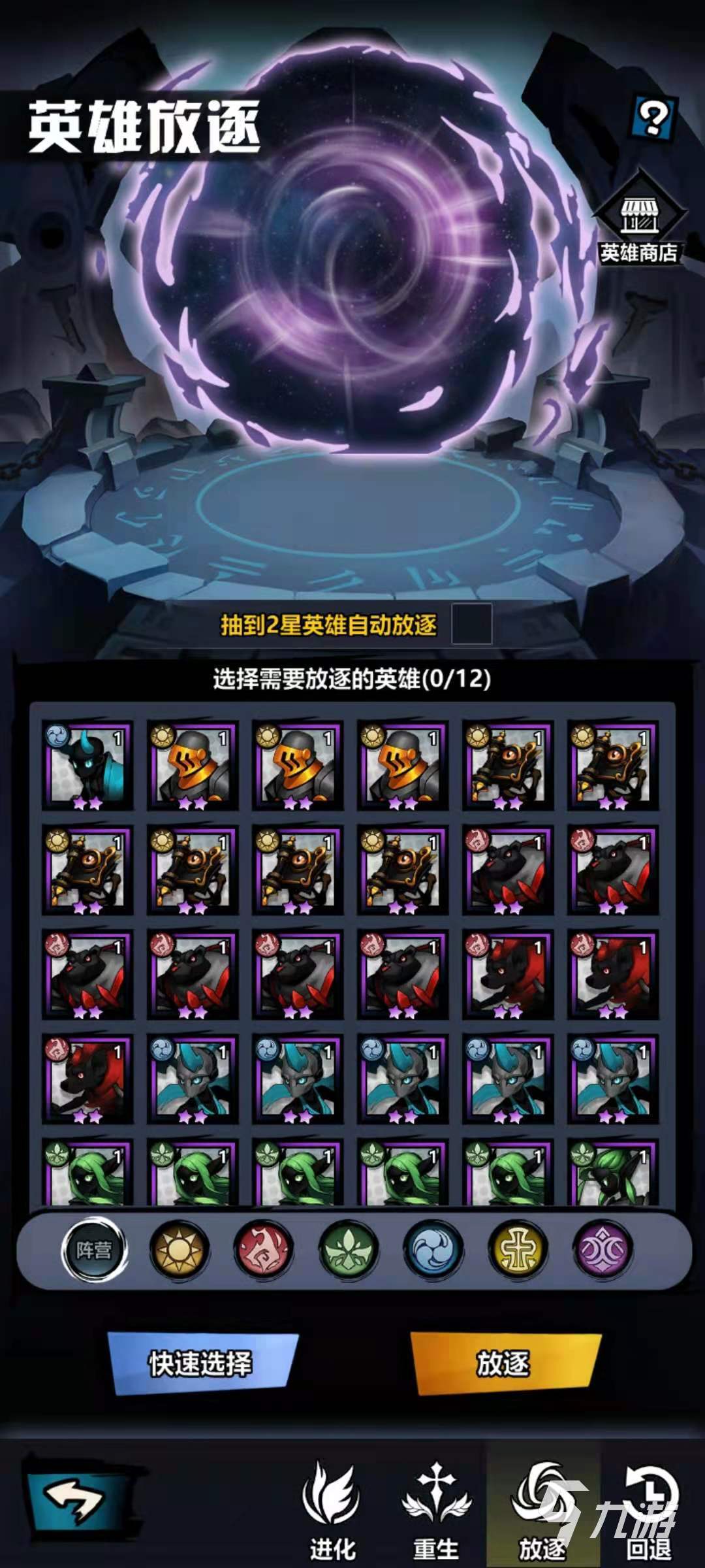 選擇想要分解的卡片之后,再點(diǎn)擊放逐就可以直接分解了,也可以使用快速選擇功能,直接將全部的綠色卡片都分解掉,分解得到的材料是源生符石和閃亮硬幣。源生符石是提升火柴人英雄等級(jí)的必備道具,閃亮硬幣可以在英雄商店中兌換自己需要的英雄,確實(shí)做到了廢物利用。