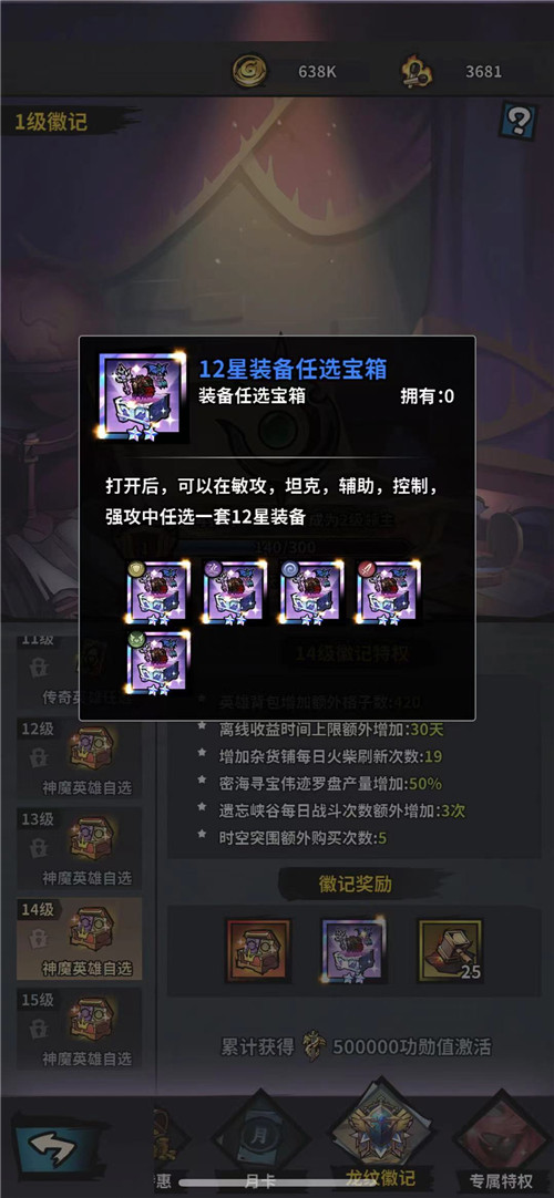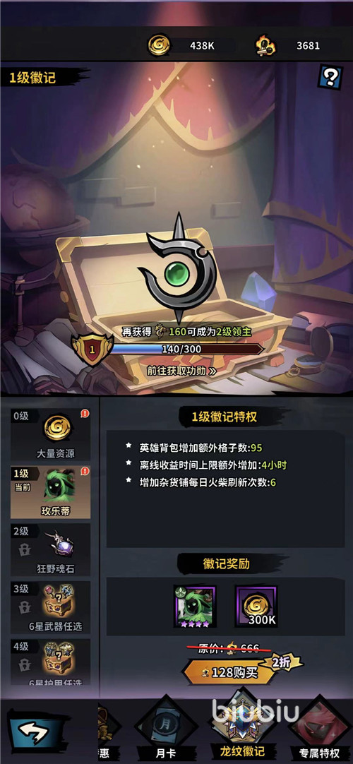比如0級(jí)徽記特權(quán)英雄背包增加額外格子數(shù)40,到了1級(jí)就會(huì)額外增加90,離線收益上線時(shí)間也從2小時(shí)變?yōu)?小時(shí)。到了更高等級(jí)的徽記特權(quán)還會(huì)有更多的特權(quán)。