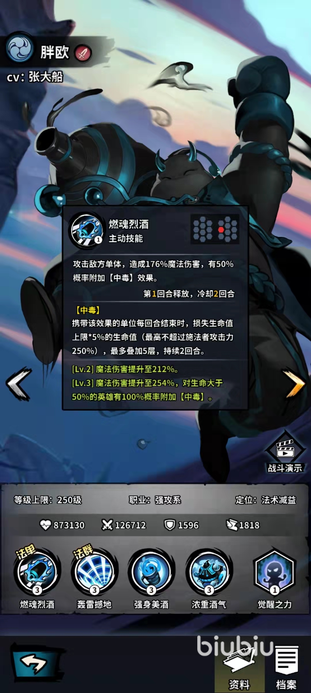 這樣一來在己方英雄技能的負(fù)面狀態(tài)幫助下,離可以打出高額的傷害。胖歐也是一個帶有中毒效果的英雄,主動技能燃魂烈酒可以造成單體中毒,必殺技有幾率為傷害目標(biāo)施加幻覺效果,限制性很強。