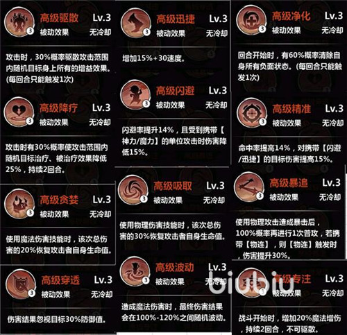 游戲中魂石技能庫有33個技能,每個技能都分為低級、中級和高級。比如迅捷,低級就是增加3%+10的速度,中級增加9%+20的速度,高級增加15%+30的速度,也就是數(shù)值改變,效果不變,其他所有技能都是如此。