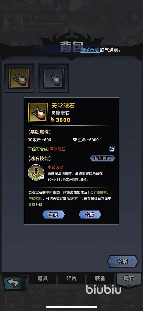 當(dāng)然玩家如果不想要自帶的初始技能,也可以通過重鑄來改變技能。魂石重鑄需要魂能精華,可以通過分解魂石獲得。