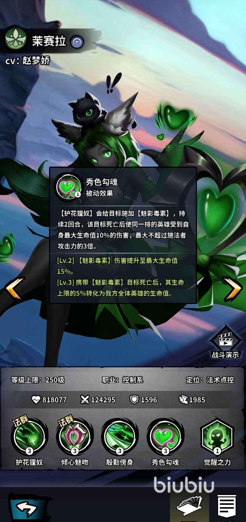 他的第2個(gè)技能也是一個(gè)主動(dòng)技能,屬于茉賽拉的必殺技,在釋放之后可對(duì)敵方全體目標(biāo)造成70%的魔法傷害,并且有100%的概率隨機(jī)魅惑一名敵人,這個(gè)魅惑的效果就是讓敵方無(wú)法選中目標(biāo)進(jìn)行攻擊,這一技能在游戲?qū)种锌梢哉f(shuō)是非常的有用,他能幫助輸出角色盡可能的去躲避傷害,大大增加了友方輸出角色的存活。