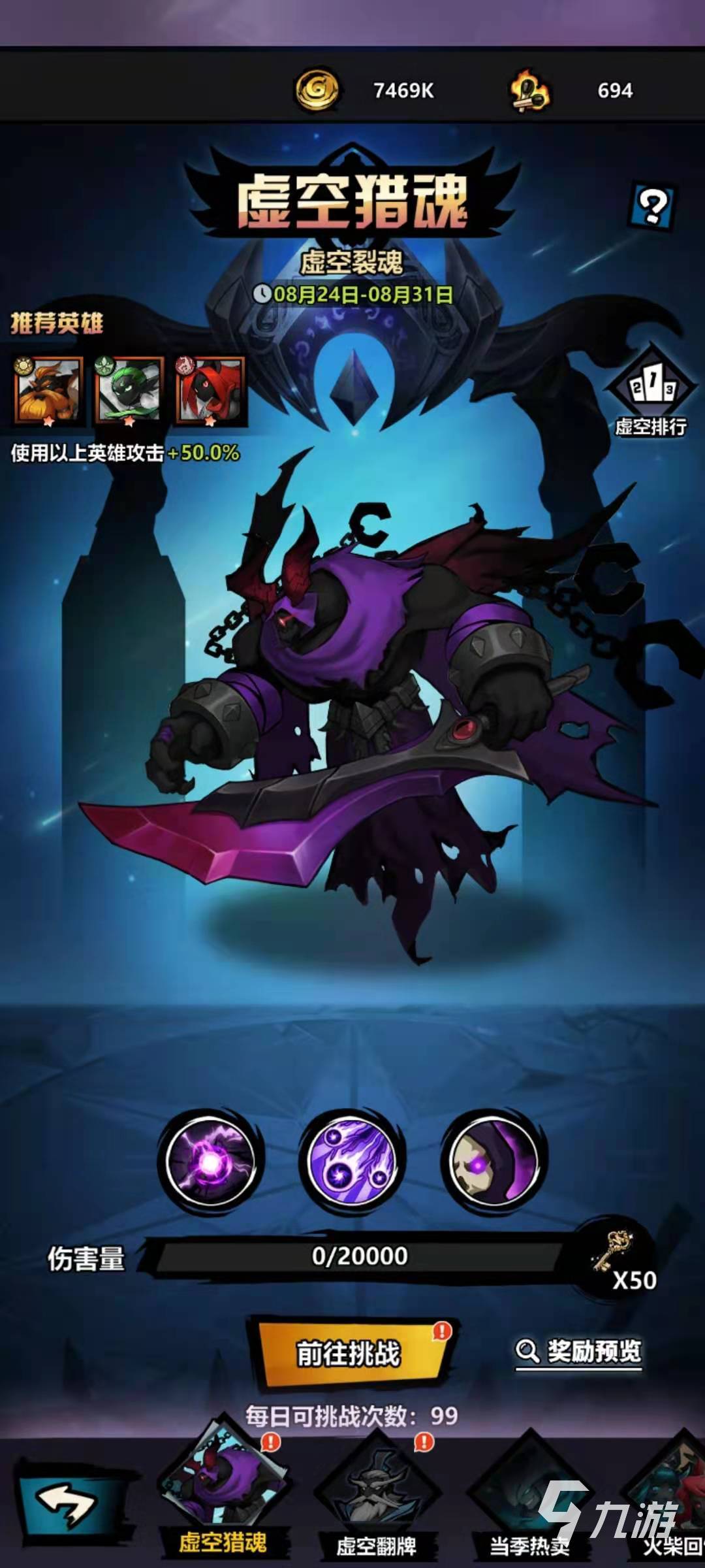 虛空獵魂中的BOSS每天可以挑戰(zhàn)九十九次,然后按照最大的傷害量來(lái)進(jìn)行獎(jiǎng)勵(lì),最后也是按照這個(gè)來(lái)進(jìn)行排名,所以傷害是最重要的。所以肉盾英雄在這里面起到的作用不大,因?yàn)樘摽誃OSS的傷害并不高,,前排基本上不會(huì)被突破,所以小編建議大家上純傷害的陣容,最多帶上一個(gè)可以增加輸出的輔助。