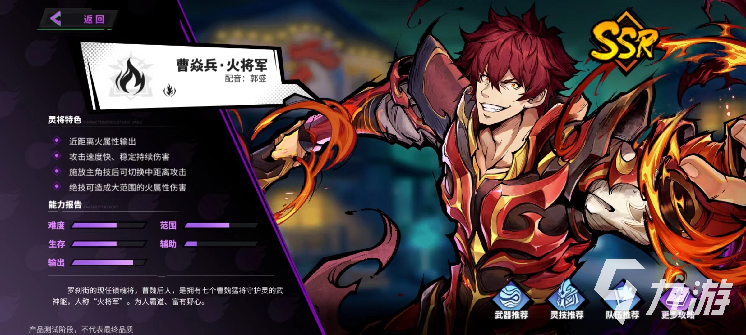 曹焱兵角色詳細(xì)劃分為了曹焱兵烈焰騎手,曹焱兵少年和曹焱兵火將軍,而最后一名才是目前最火爆的SSR級(jí)別角色,也是今天小編要來(lái)重點(diǎn)給大家介紹的對(duì)象。作為鎮(zhèn)守羅剎街的鎮(zhèn)魂將,曹焱兵火將軍使用火屬性進(jìn)行攻擊,擅長(zhǎng)近距離戰(zhàn)斗,攻擊速度非常快,能夠穩(wěn)定地造成持續(xù)傷害。但是在釋放主角技能時(shí)攻擊距離會(huì)有所提升,變?yōu)橹芯?,使用絕技能夠?qū)Υ蠓秶鷥?nèi)敵人造成高額火屬性傷害,是現(xiàn)在輸出隊(duì)重點(diǎn)培養(yǎng)對(duì)象。