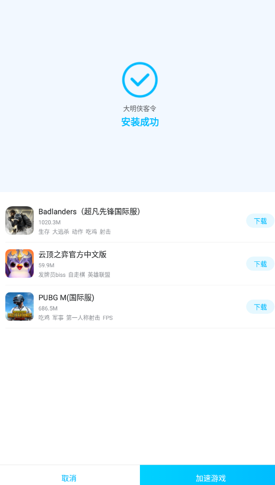 當這款游戲安裝好了之后,系統(tǒng)還會出現(xiàn)一個提示界面,在這個界面的最下端,就有一個加速游戲的選項,玩家只需要點擊這個選項,就可以正式開始加速這款游戲了。