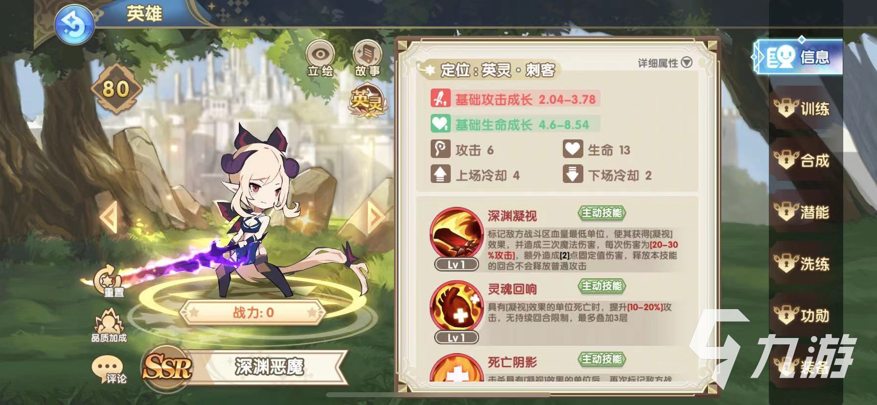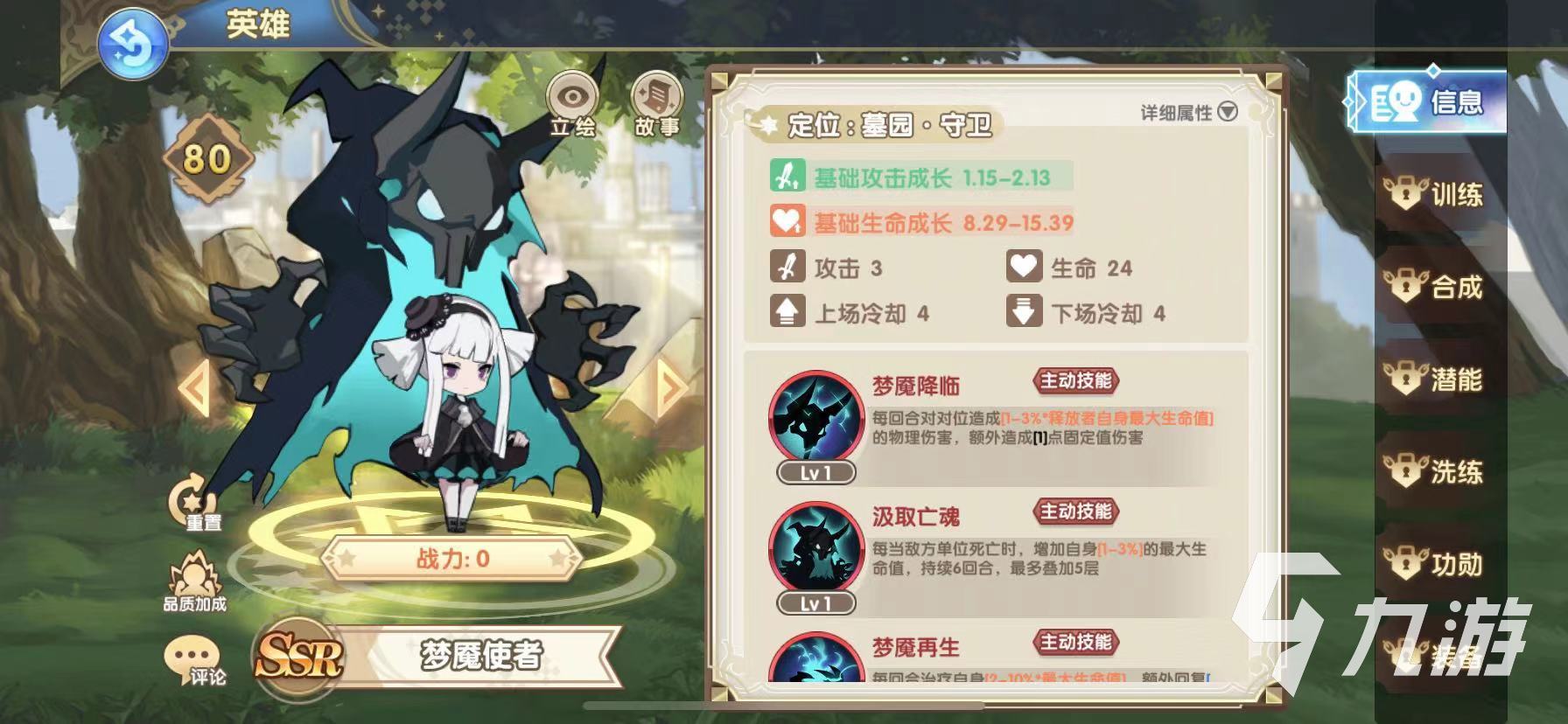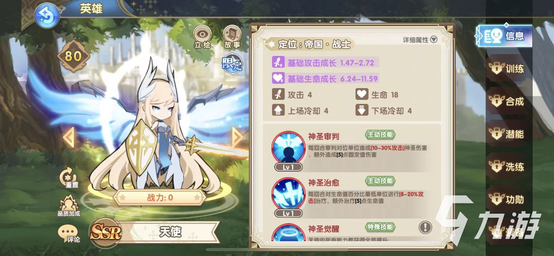 天使在游戲里的定位為戰(zhàn)士,品階為SSR,她一共擁有三個(gè)技能,都是主動(dòng)技能,一技能可對(duì)敵方輸出造成一定的物理攻擊,二技能還有一定的治療效果,在每回合結(jié)束之后,可以為當(dāng)前生命值最低的友方成員恢復(fù)等同于自身攻擊20%的生命,總而言之,天使就是一個(gè)非常全面型的戰(zhàn)士,他既有一定的輸出效果,又有一定的輔助能力。