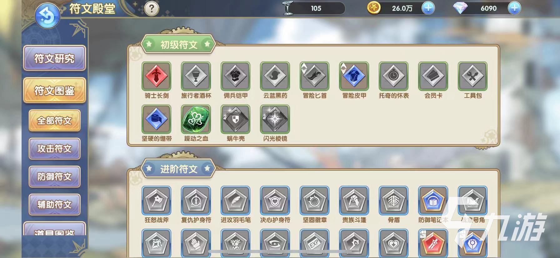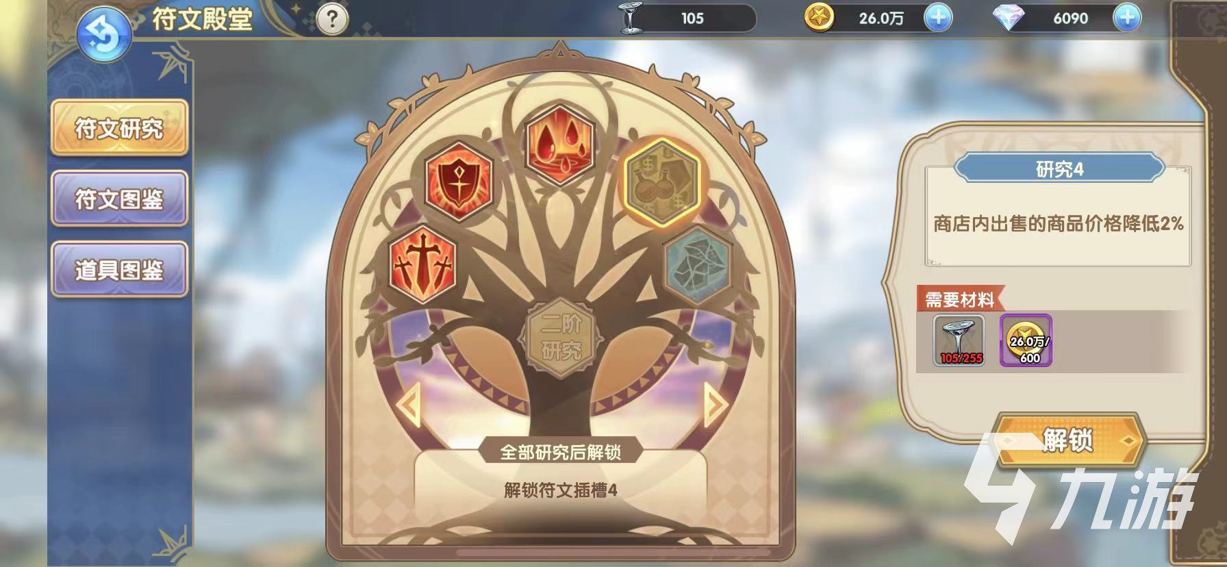 顧名思義,符文圣殿正是玩家研究符文的重要場(chǎng)所。玩家無論是通過購(gòu)買還是做任務(wù)獲取到的符文都是有一個(gè)屬性值的,而在符文殿堂內(nèi)玩家可通過解鎖不同的符文卡槽去提升符文屬性。當(dāng)玩家等級(jí)達(dá)到23級(jí)的時(shí)候,在游戲主頁面可以解鎖符文殿堂,進(jìn)入符文殿堂里面會(huì)有三個(gè)板塊,分為符文研究,符文圖鑒以及道具圖鑒。