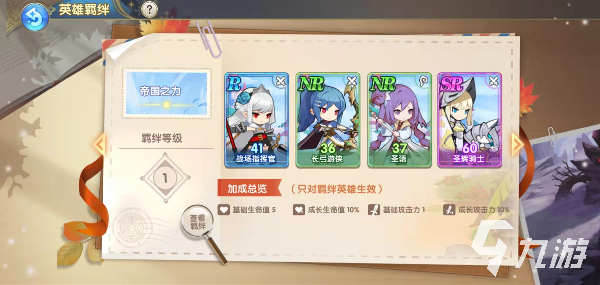 帝國(guó)之力的羈絆等級(jí)是一級(jí),是由R級(jí)戰(zhàn)場(chǎng)指揮官,NR級(jí)長(zhǎng)弓游俠,NR級(jí)圣語(yǔ)和SR級(jí)圣輝騎士組成的羈絆之力,羈絆英雄全部完成三階訓(xùn)練,那么羈絆英雄就會(huì)增加百分之十的攻擊和血量成長(zhǎng),兩點(diǎn)攻擊力,羈絆英雄全部達(dá)到SR品質(zhì),那么羈絆英雄還會(huì)增加百分之十攻擊和血量成長(zhǎng),八點(diǎn)生命值,羈絆英雄全部達(dá)到SSR品質(zhì),那么羈絆英雄就會(huì)增加百分之十五的攻擊和血量加成,三點(diǎn)攻擊力和十點(diǎn)生命值,羈絆英雄全部完成六階訓(xùn)練,羈絆英雄增加百分之二十的攻擊力和血量成長(zhǎng),十五點(diǎn)生命值,羈絆英雄全部達(dá)到UR品質(zhì),羈絆英雄增加百分之二十五的攻擊和血量加成,四點(diǎn)攻擊力和十六點(diǎn)生命值,羈絆英雄全部完成全部訓(xùn)練,羈絆英雄增加百分之三十攻擊和血量成長(zhǎng),六點(diǎn)攻擊力,二十點(diǎn)生命值,最基礎(chǔ)的擁有指定的羈絆英雄,羈絆英雄增加百分之十攻擊和血量成長(zhǎng),一點(diǎn)攻擊力和五點(diǎn)生命力,但是玩家們請(qǐng)注意,這只對(duì)羈絆英雄生效,對(duì)其他的英雄是沒(méi)有可用價(jià)值的。