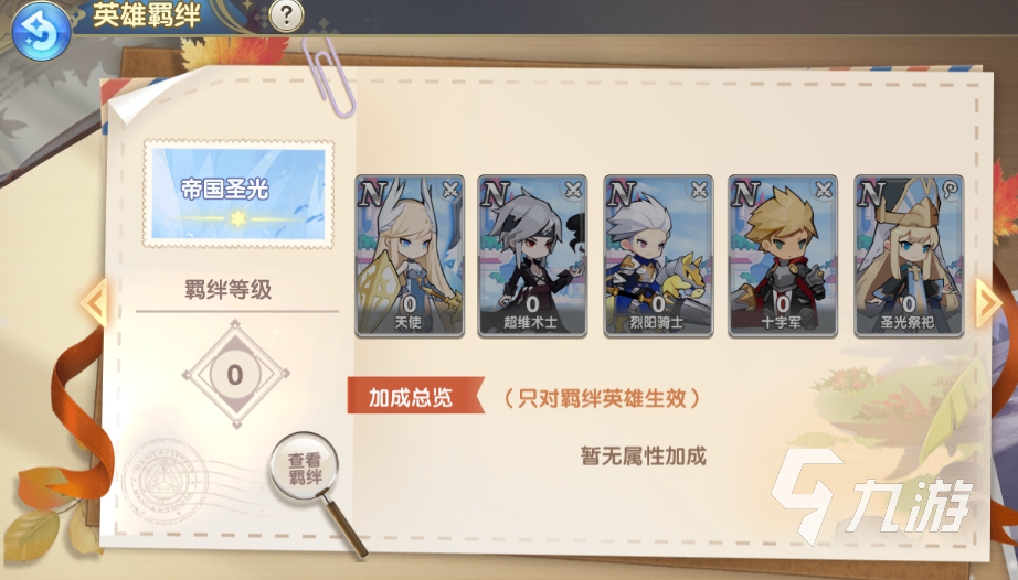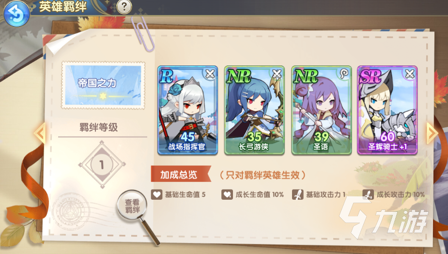 在進(jìn)入到羈絆界面之后可以看到,羈絆是分為很多個(gè)分類的,比如說帝國之力這個(gè)羈絆,就有指揮官、游俠、圣語和圣輝騎士來組成的。玩家只要在游戲中收集到這幾個(gè)英雄的話,那么系統(tǒng)就會(huì)自動(dòng)的將這個(gè)羈絆能力給激活??梢灾苯釉趯?duì)應(yīng)的羈絆中查看到加成的屬性,這個(gè)屬性一般都是包含的攻擊力以及生命值加成等,收益還是非常不錯(cuò)的。